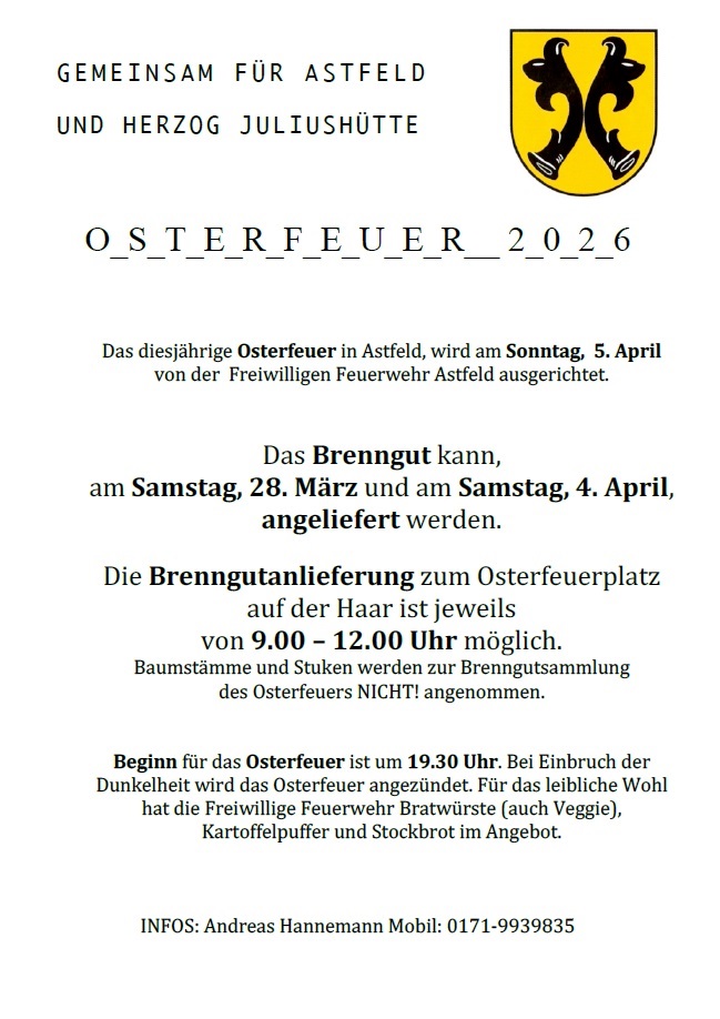 Auf diesen Seiten möchten wir allen interessierten Bürgern ein paar wichtige Informationen, wie z. B. die Kontaktdaten zu unserem Ortsrat, und auch Hinweise zu aktuellen Aktivitäten in und um Astfeld und Herzog-Juliushütte geben.